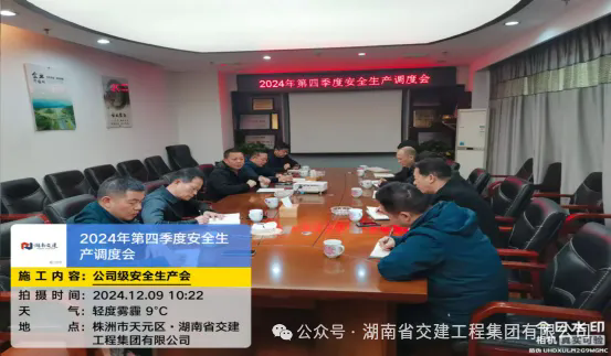 2024年12月9日,湖南省交建工程集團有限公司董事長謝志方主持召開了2024年第四季度安全生產調度會,強調安全生產是公司經營管理的重中之重,必須緊抓不懈,要求嚴格落實安全生產責任制,并部署安全生產具體工作。董事長提出,在歲末年初之際,各部門(分公司)更要精心組織開展安全隱患大排查大整治活動,重點檢查施工現(xiàn)場的機械設備、臨時用電、高處作業(yè)等環(huán)節(jié),對排查出的隱患問題,及時制定整改方案,落實責任人,限期整改,確保隱患徹底消除。