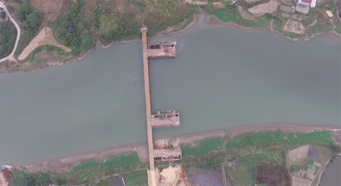 漣水河呈東西走向,河流由西向東,垂直通過設(shè)計路線,河道寬為,河面寬,水深約5~10米。橋梁設(shè)計10、11號主墩常年位于漣水河中,9號墩枯水季節(jié)位于河岸位置,建設(shè)難度大。益婁高速第十一合同段克服種種困難,制訂切實可行的施工方案,采取最嚴格的安全管理措施,投入大量的機械設(shè)備和人力資源,從技術(shù)上保正施工如期進行。由于漣水河大橋主橋9~11號墩基礎(chǔ)在深水中施工,便橋搭建難度大。項目部采取搭設(shè)鋼棧橋施工工藝,鋼棧橋長達,寬,采用64根ΦA(chǔ)630*鋼管樁打入河床作為支撐,縱向采用11組貝雷梁作為承重主梁。同時在9、10、11墩搭設(shè)三個長、寬的作業(yè)平臺,每個平臺用28根ΦA(chǔ)630*鋼管樁打入河床作為支撐,橫橋向用11組貝雷梁作為承重主梁。鋼棧橋搭建后,施工隊在水中鋼管樁平臺用沖擊鉆鉆孔,安裝鋼筋籠,灌注水下砼,并用鋼套箱法澆筑水中系梁。引橋為6×+3×40mT梁,主橋為++預應(yīng)力砼變高截面懸澆連續(xù)箱梁。下部結(jié)構(gòu)橋臺采用肋板臺,橋墩采用柱式墩,墩臺采用樁基礎(chǔ)。